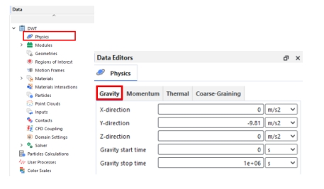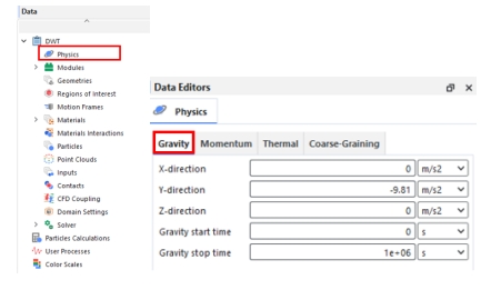 ④相互作用设置:对于全部边界的Default Boundary以及对应颗粒的Default Particle保持默认,在Material Interactions 的Data Editors面板,从左侧下拉列表中选择 Default Particles,然后从右侧下拉列表中选择其中一对:Default Particles、Default Boundary,分别设置相互作用。