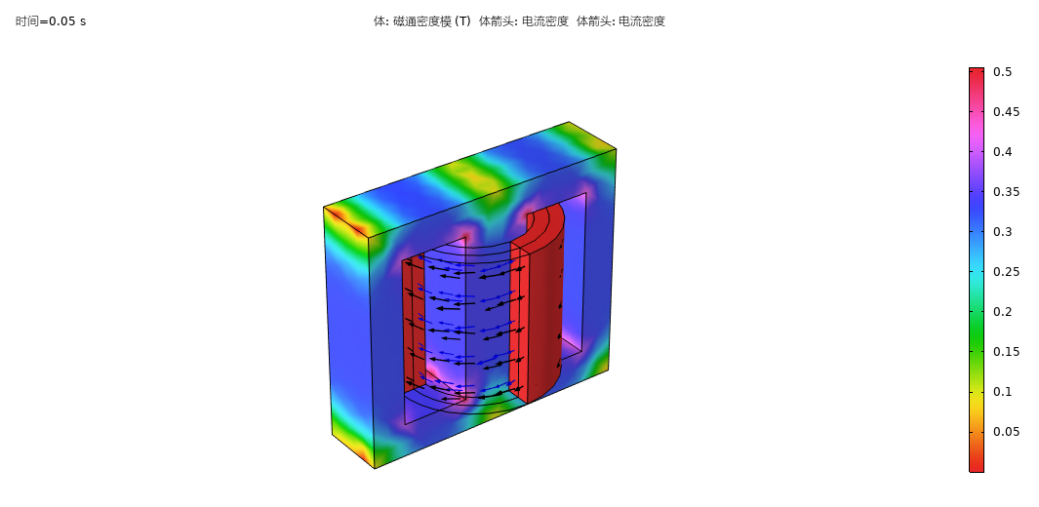 磁通密度主要集中于铁芯内部,线圈周围存在可控漏磁,符合变压器磁路设计原理。