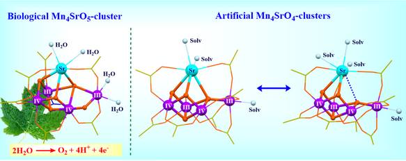 光合作用水裂解催化中心(又称放氧中心,简称OEC)是自然界唯一能高效、安全将水裂解为电子、质子和氧气的生物催化剂。生物OEC是一个独特的Mn4CaO5-簇合物,其钙离子可被锶离子替换形成一个Mn4SrO5簇合物。研究OEC的构效关系、催化机理和人工合成策略,因具有重要的科学意义和潜在的应用价值长期以来广受关注,但也一直是极具挑战性的科学前沿。